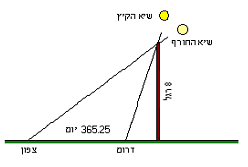 בציור זה אנו רואים כיצד הסינים הקדמונים השתמשו בשעון צל פשוט בגובה 8 רגל הניצב בזווית ישרה. על הקרקע נרשמו מצבי הצל. הסינים חלקו את השנה בת 365 יום (ול 24 חלקים בשנה) הכוללים את ארבע עונות השנה. כל חלק סומן בנקודה על פי הצל של אותו יום. הצל הקצר ביותר היה שייך לשיא הקיץ ואילו הצל הארוך ביותר לשיא החורף. לאחר שחברו כל קו למשנהו נוצר מבנה גיאומטרי המתאים לתמונה להלן.