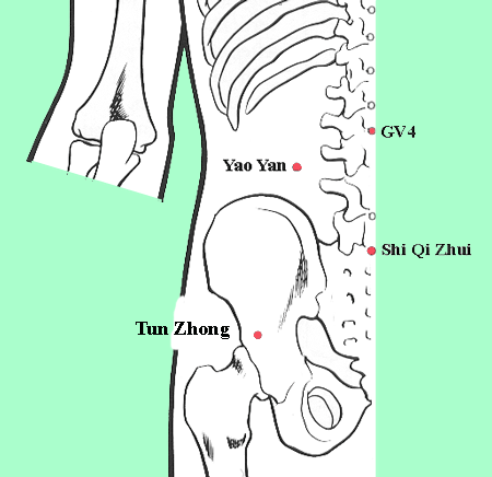 Pressing - לחיצה על Yao Yan . נקודה המכונה Waist´s eye [= עיני המותניים] . ממוקמת על הקו החיצוני של מרידיאן שלפוחית השתן, לטרלית לזיז הספינלי של L3 מתחת ל UB-47 בגבול הלטרלי של השריר Sacrospinalis. זוהי נקודה לבעיות גב תחתון ומצבים גינקולוגים.